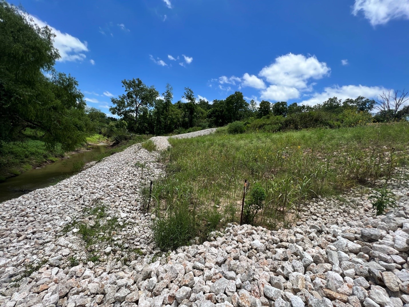 Longitudinal Stone Toe at Big Creek, 1.5 years post construction with vegetation and sediment naturally repairing slope at Brazos Bend Sate Park.